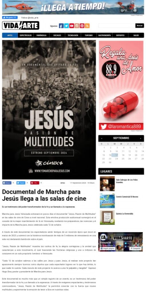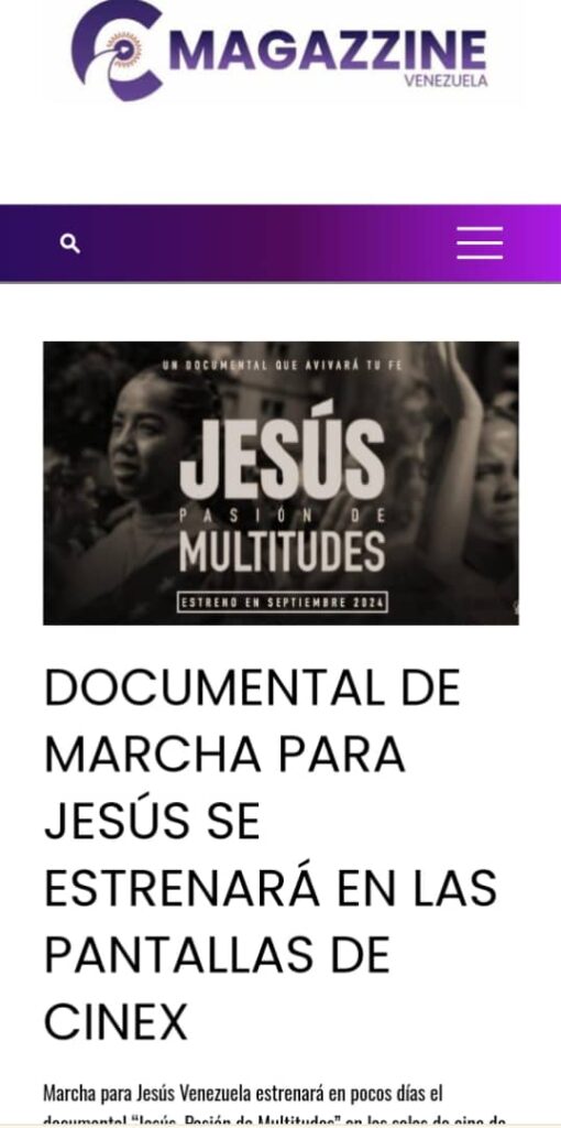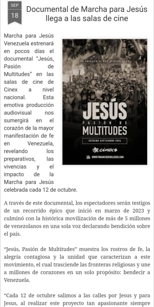 El movimiento de fe más grande de Venezuela marca un precedente histórico al trasladar su mensaje de esperanza y unidad a las salas de cine de todo el país. Gracias a una alianza estratégica con la cadena Cinex, el documental «Jesús, Pasión de Multitudes» se estrena a nivel nacional, permitiendo que miles de personas vivan la emoción de la Marcha para Jesús desde una perspectiva nunca antes vista.