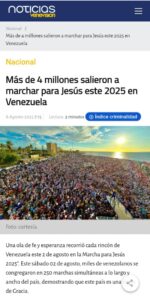 Venezuela ha hecho historia. El pasado sábado 2 de agosto de 2025, las calles de toda la geografía nacional fueron testigos de una movilización sin precedentes: más de 4 millones de venezolanos se unieron en un solo espíritu para adorar a Jesucristo. Bajo el lema «Jesús, las naciones te pertenecen», el país se convirtió en el epicentro de un despertar espiritual que resonó en todo el continente.